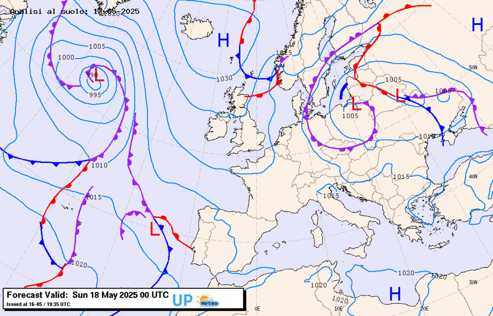 Questa mappa rappresenta i campi di alta pressione e bassa pressione con le isobare (step di 2 mB) e i campi termici con indicazione delle isoterme al suolo (step di 4 gradi Celsius).