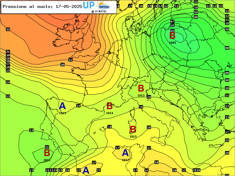 Questa mappa rappresenta la distribuzione delle zone di alta pressione (rosso) e di bassa pressione (blu).