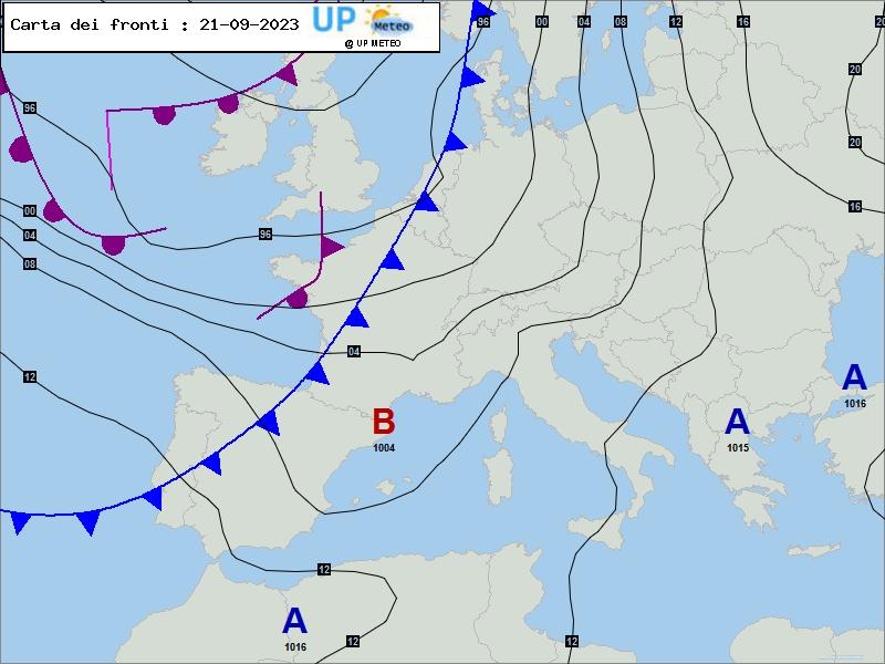 Questa mappa rappresenta i fronti meteorologici (fronte caldo, fronte freddo, fronte occluso) con indicazione della pressione al suolo (isobare a step di 4 mB) e dei minimi e massimi barometrici.