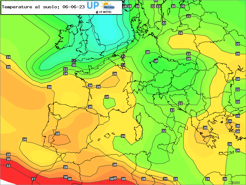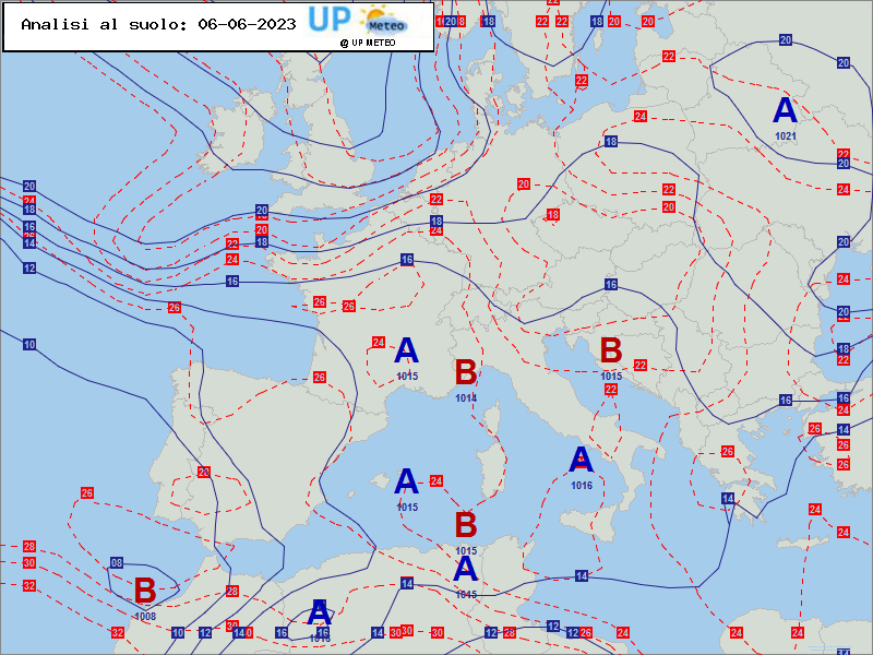 Questa mappa rappresenta i campi di alta pressione e bassa pressione con le isobare (step di 2 mB) e i campi termici con indicazione delle isoterme al suolo (step di 4 gradi Celsius).