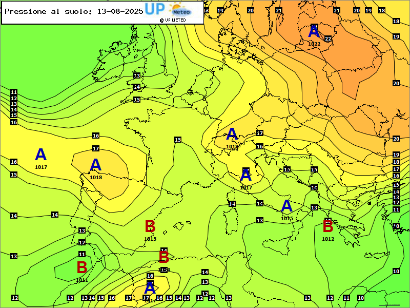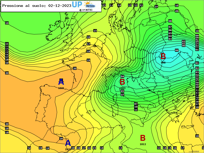 Questa mappa rappresenta la distribuzione delle zone di alta pressione (rosso) e di bassa pressione (blu).